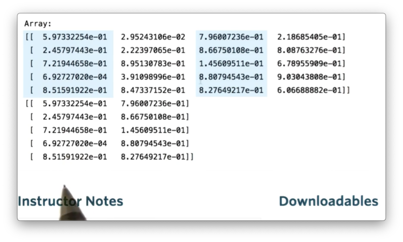 NumPy also supports slicing. Generally, to retrieve the cells bounded by the (zero-based) index values start_row , end_row, start_col and end_col, we do the following: