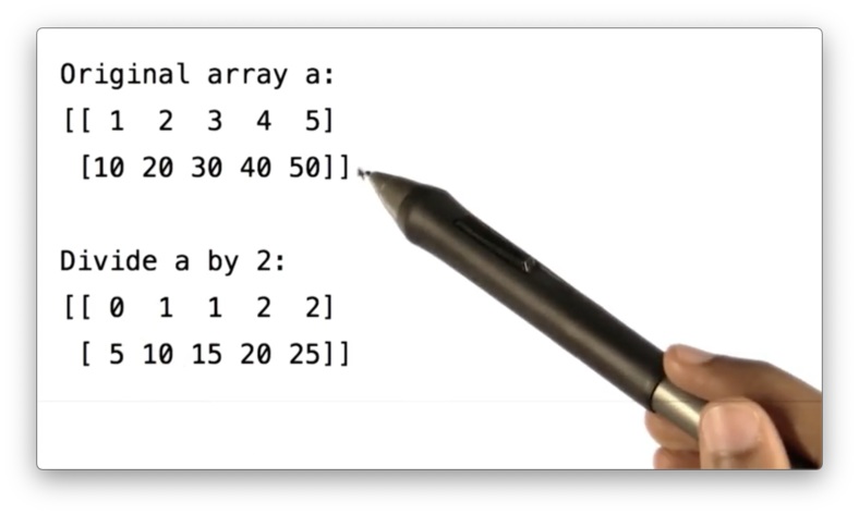 Note that both the divisor and the elements in the ndarray are integers. As a result, integer division (rounding down, roughly) is performed, which is why 1 / 2 equals 0.