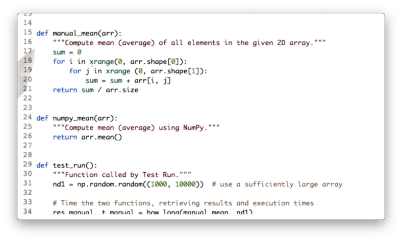 We then define the two functions that we want to test. The function numpy_mean simply calls the mean method on the passed in arr. The function manual_mean iterates over all of the elements, sums them and then divides them by the total number of elements.