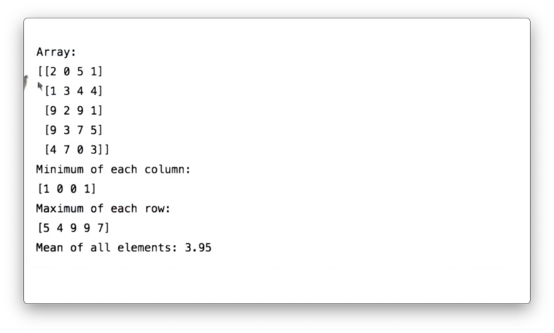 We can pull some basic statistics from an ndarray with the min, max, and mean methods, which all optionally take an axis parameter. for example: