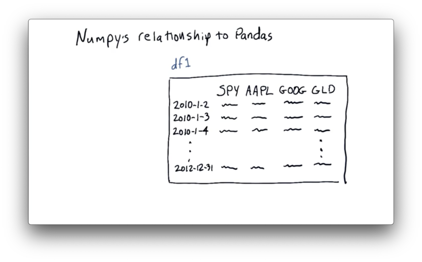 Of course, we create DataFrames because pandas builds a lot of great functionality on top of these ndarrays. For example, pandas provides expressive ways to access data in the array, such as symbol-based column indexing and date-based row indexing in the case of df.
