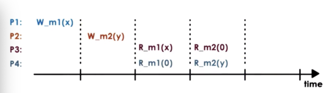 In the above case, we cannot let P3 observe one value at a m1 while concurrently showing a different value to P4, which is also accessing m1.
