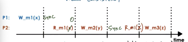 Once a synchronization is performed on P2, P2 will see all of the previous updates that have happened to any memory location in the system. When P2 performs the sync, it is guaranteed to see the value of m1 at the time that P1 performed the sync.