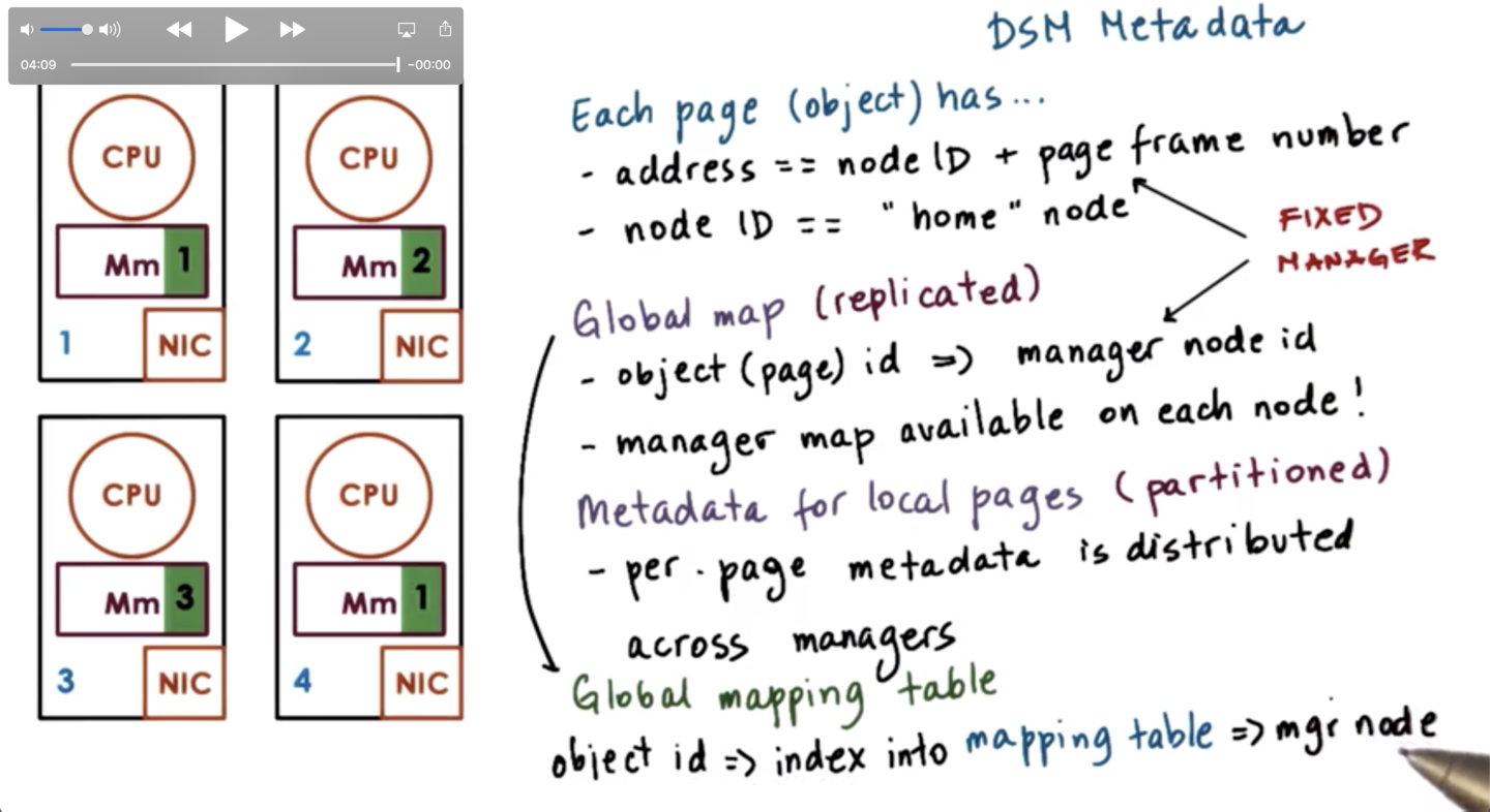 In order to do this, the DSM component has to maintain some metadata. Each page has an address, which is some combination of the node ID and the page frame number on that node.