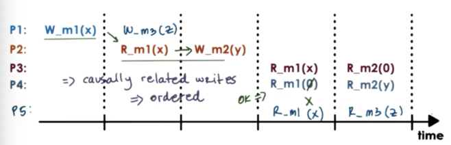 In this situation, a causal consistency model will enforce that a process must read X from m1 before reading Y from m2.