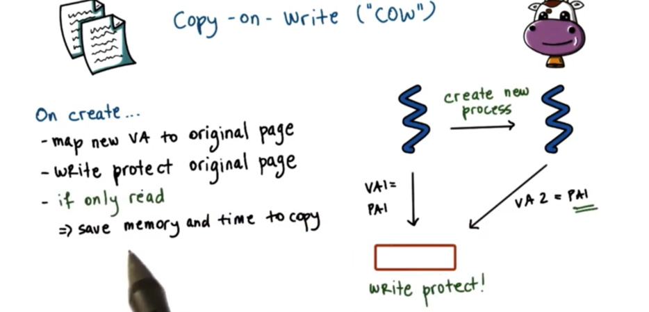 In order to avoid unnecessary copying, a new process's address space, entirely or in part, will just point to the address space of its parent. The same physical address may be referred to by two completely different virtual addresses belonging to the two processes. We have to make sure to write protect the page as a way to track accesses to it.