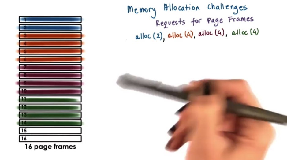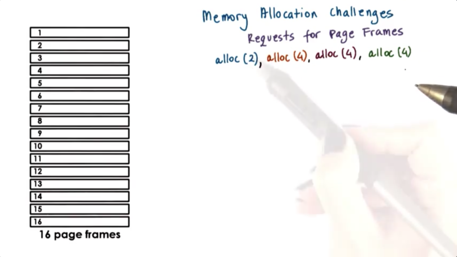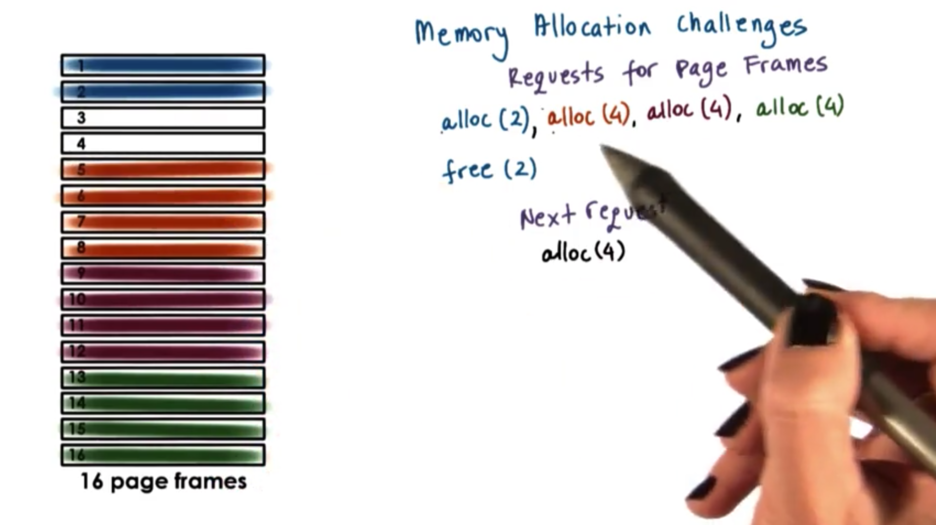 Consider a page-based memory management system that needs to manage 16 page frames. This system takes requests for 2 or 4 pages frames at a time and is currently facing one request for two page frames, and three requests for four page frames. The frames must be allocated contiguously for a given request.