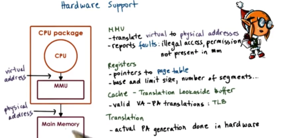 Another way that hardware supports memory management is by assigning designated registers to help with the memory translation process. For instance, registers can point to the currently active page table in a page-based memory system. In a segmentation system, the registers may point to the base address, the size of the segment and the total numbers of segments.