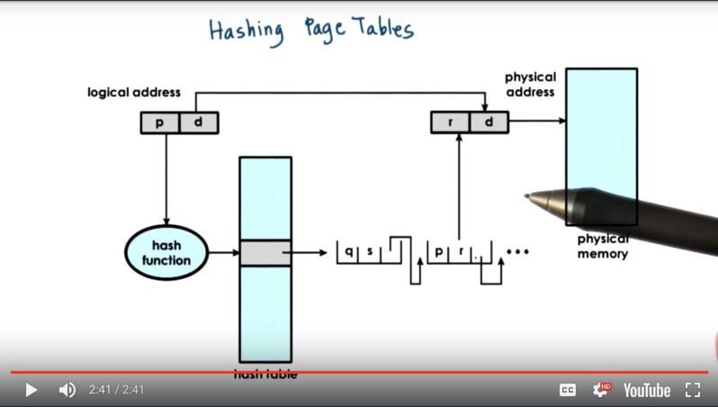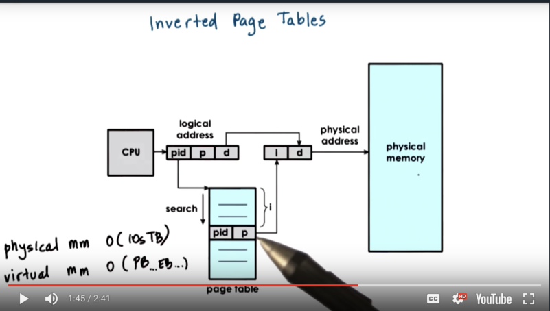 Inverted page tables are often supplemented with hashing page tables. Basically, the address is hashed and looked up in a hash table, where the hash points to a (small) linked list of possible matches. This allows us to speed up the linear search to consider just a few possibilities.