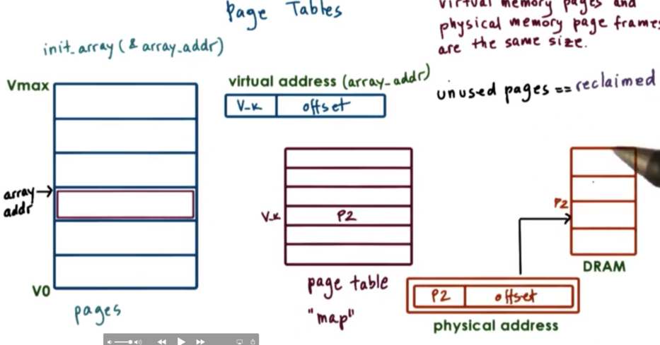 What this means is that only the first portion of the virtual address is used to index into the page table. We call this part of the address the virtual page number (VPN), and the rest of the of the virtual address is the offset. The VPN is used as an index into the page table, which will produce the physical frame number (PFN), which is the first physical address of the frame in DRAM. To complete the full translation, the PFN needs to be summed with the offset specified in the latter portion of the virtual address to produce the actual physical address. The PFN with the offset can be used to reference a specific location in DRAM.