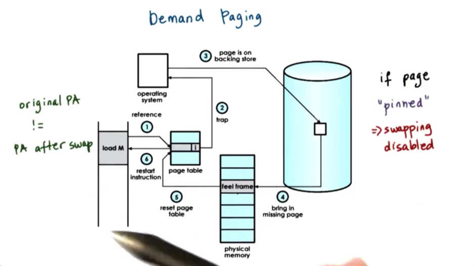 We may require a page to be constantly present in memory, or maintain its original physical address throughout its lifetime. We will have to pin the page. In order words, we disable swapping. This is useful when the CPU is interacting with devices that support direct memory access, and therefore don't pass through the MMU.