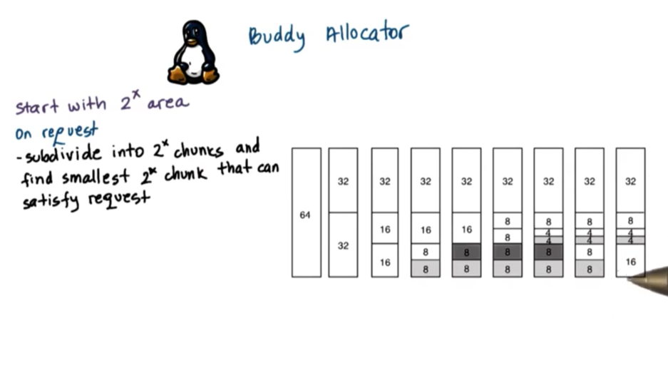 This buddy checking step can continue up the tree, aggregating as much as possible. For example, imagine requesting 1 memory unit above, and then freeing it. We would have to subdivide the chunks all the way down to 1, but then could build them all the way back up to 64 on free.
