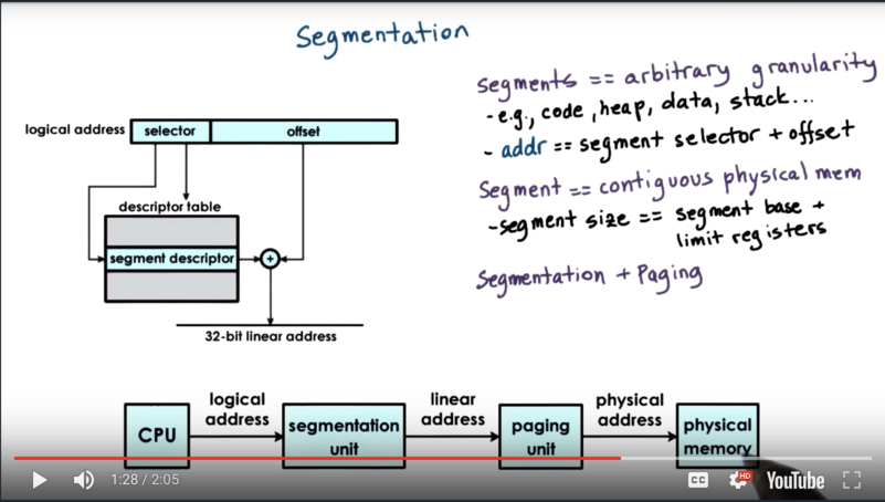 Virtual to physical memory mappings can also be maintain using segments. With segments, the address space is divided into components of arbitrary size, and the components will correspond to some logically meaningful section of the address space, like the code, heap, data or stack.