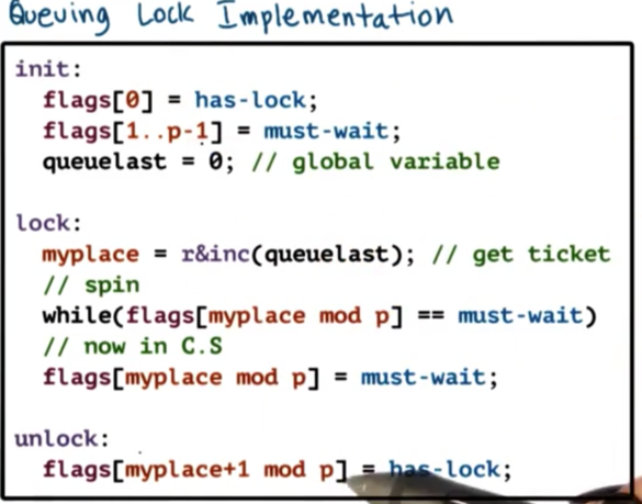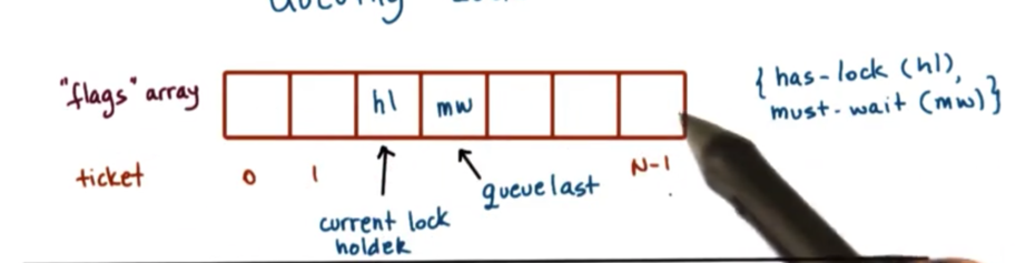 The queueing lock uses an array of flags with up to n elements, where n is the number of threads in the system. Each element in the array will have one of two values: either has_lock or must_wait. In addition, one pointer will indicate the current lock holder (which will have a value of has_lock), and another pointer will reference the last element on the queue.
