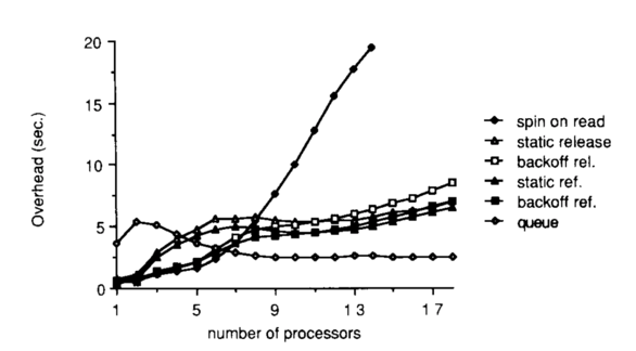 Under high load, the queueing lock performs the best. It is the most scalable; as we add more processors, the overhead does not increase.