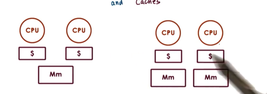 For example, we may not even allow a CPU to write to its cache. A write will go directly to main memory, and any cache references will be invalidated. This is called no-write.