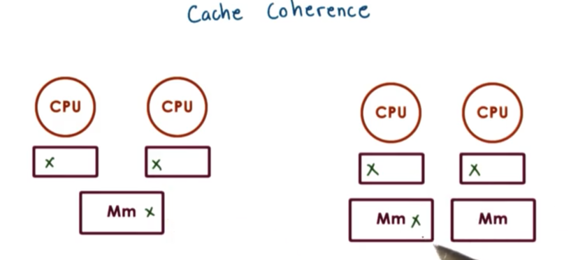 On some architectures this problem needs to be dealt with completely in software; otherwise, the caches will be incoherent. For instance, if one CPU writes a new version of X to its cache, the hardware will not update the value across the other CPU caches. These architectures are called non-cache-coherent (NCC) architectures.