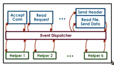 When the handler needs to initiate an I/O operation that can block, the handler passes the call to the operation to a helper, and returns to the event dispatcher. The helper will be the one that handles the blocking I/O operation and interact with the dispatcher as necessary.