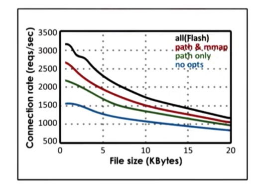 We can see that in all cases, connection rate decreases with file size. That being said, connection rate increases as the number of optimization increases, with the fully optimized flash having the highest connection rate at a given file size. Optimizations are important!