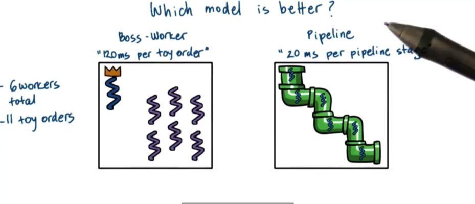 If execution time is important, pick the pipeline model. Rather, if we care about the average time to complete the order, the boss/workers model is better.