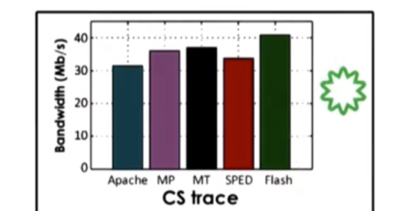 The CS trace is a much larger trace, which means that most requests are not serviced from the cache. Since the SPED implementation does not support asynchronous I/O the performance drops significantly. The multithreaded implementation does better than the multiprocess implementation because the multithreaded implementation has a smaller memory footprint (more memory available to cache files) and is able to synchronize more quickly/cheaper.