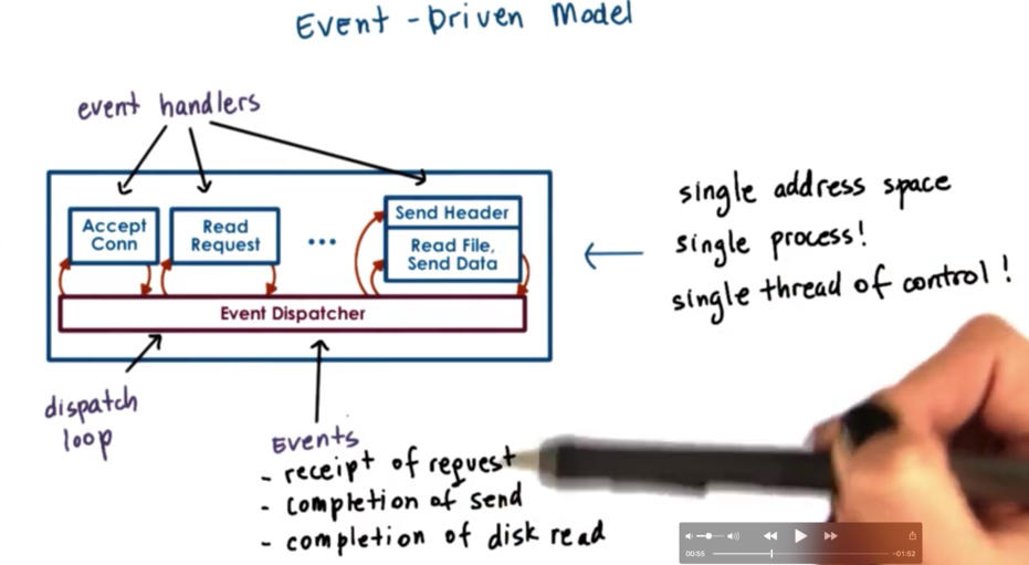 An event driven application is implemented in a single address space, with a single thread of control. The main part of the process is an event dispatcher which in a loop looks for incoming events and then based on those events invokes one or more of the registered handlers.