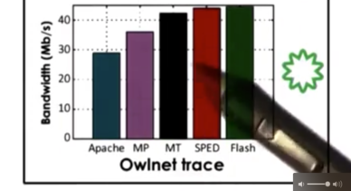 For the Owlnet trace, the results are mostly similar to the best case. We can see that Flash and SPED are the best, followed by MT/MP and then Apache. The reason for this trend is because the owl trace is very small, so most of the requests can be serviced from the cache. However, not everything can be serviced from cache, so sometime blocking I/O is required. In this case, SPED will block, but Flash will not because it has helpers. This helps explain why Flash's performance is slightly higher than the SPED implementation.