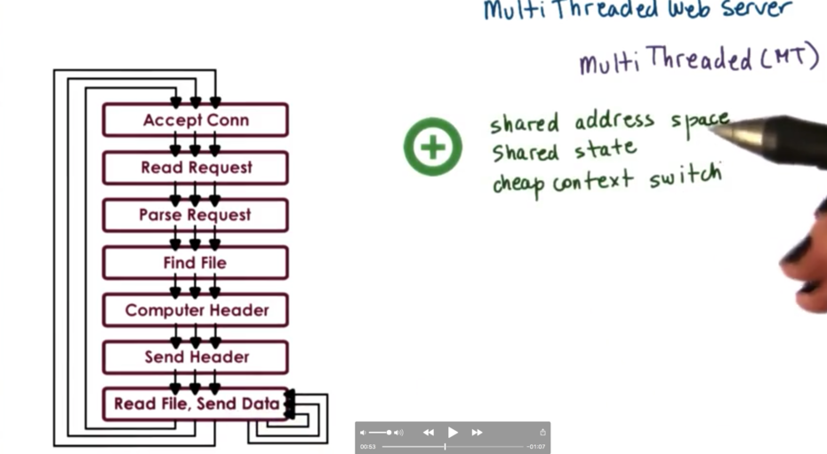 The benefits of this approach are that we have a shared address space, shared state, and a cheap user level context switch. Memory requirements are lighter, since we have a lot of shared information across all threads in he process.