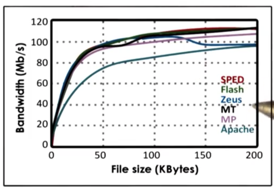 SPED has the best performance. Flash is similar in performance, but it performs the extra check for memory presence. Zeus has an anomaly, where it drops in performance after a threshold of around 125Kb. The performance of the multithreaded/multiprocess implementation are lower because of the extra synchronization requirements and the cost of context switching. Apache has the lowest performance because it has no optimizations.