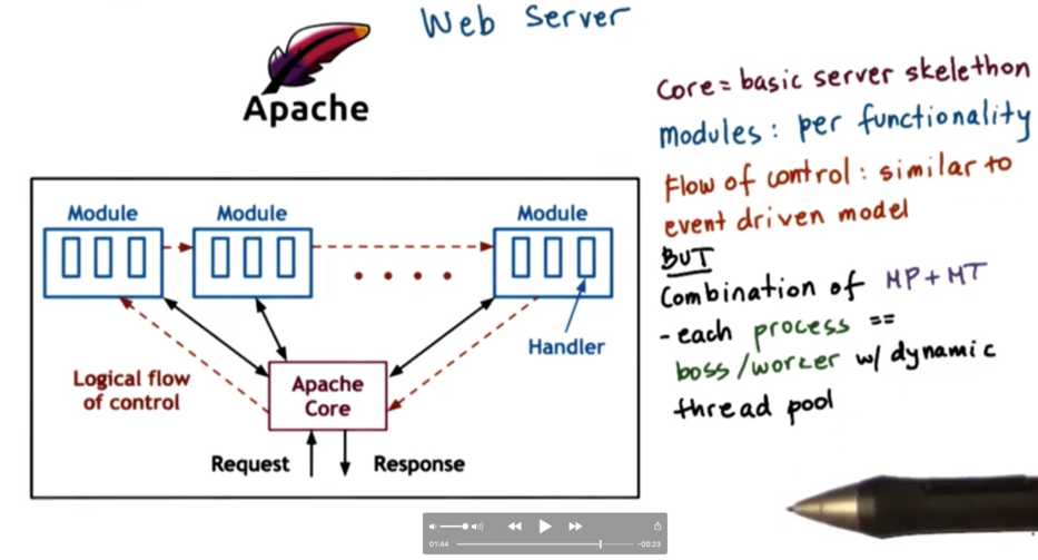 Apache is a combination of a multiprocess and multithreaded model. In apache, each instance is a process, which implements a multithreaded boss/workers configuration with a dynamic thread pool. The total number of processes can also be dynamically adjusted depending on - among other factors - the number of outstanding requests/pending connections.