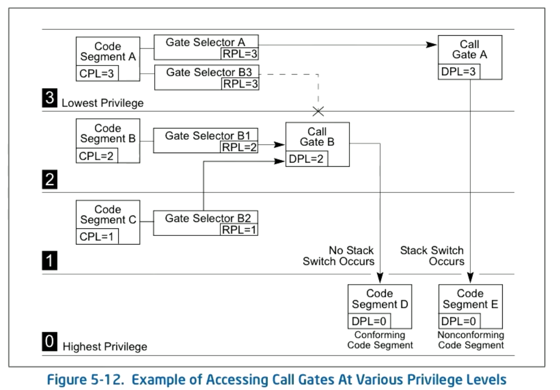 For non-conforming code segments we get a protection fault unless a call gate or task gate is specified. Call gates can be used to transfer to different privilege levels (or through system call instructions). All data segments are non-conforming.