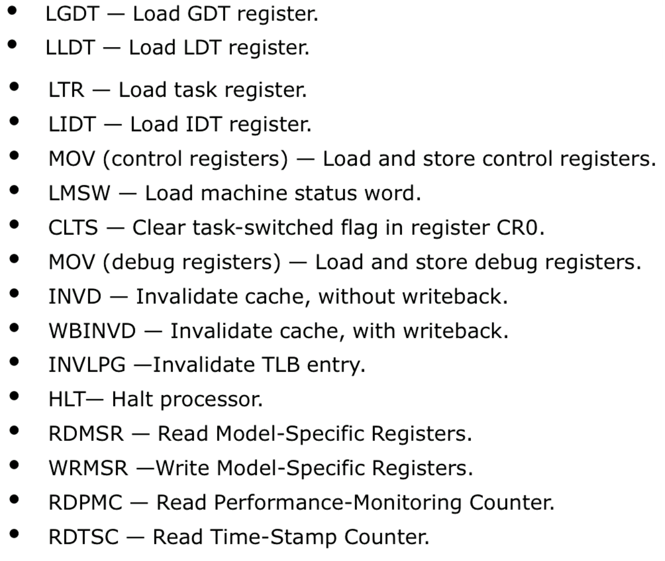 A big list of privileged instructions is given. Notably, the GDT register and LDT register control what physical memory we have access to. By making the loading of these privileged instructions we can ensure isolation.