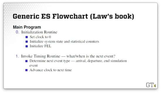 Then, we invoke the timing routine. This routine determines when the next event is, what type of event it is - arrival, departure, end of simulation - and then advances the clock to the next event.