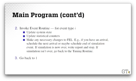 Third, we invoke the event routine itself. First, we update the system state along with our statistical counters, and then we update the FEL appropriately given the event. For example, if the routine is processing an arrival, we might generate another arrival and append or insert it into the FEL. If we are processing the event marking the end of the simulation, we generate any output and end the program; otherwise, we return to the timing routine.