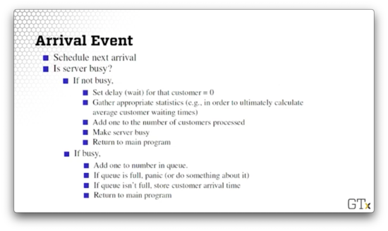 Let's talk about processing arrivals. As we alluded to previously, the first thing we do is schedule the next arrival. Next, we examine the server and see if they are busy.