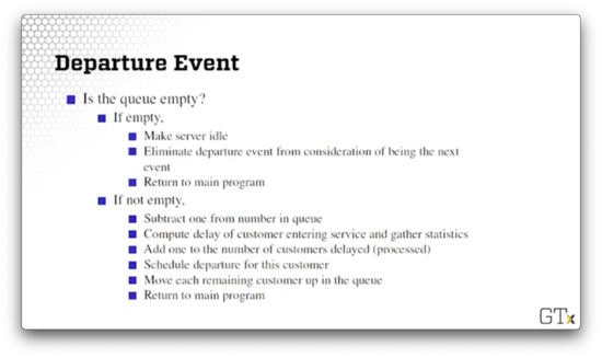 We first check to see if the queue is empty. If it is, we make the server idle since there are no more customers to serve. Additionally, we eliminate the departure event from consideration of being the next event because departures are impossible if there are no customers. Finally, we return to the main program.