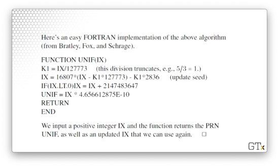 Alternatively, we can use an algorithm to generate pseudo-random numbers (PRNs); in other words, a series $R_1, R_2, ...$ of deterministic numbers that appear to be iid $\text{Unif}(0,1)$. Pick a seed integer, $X_0$, and calculate: