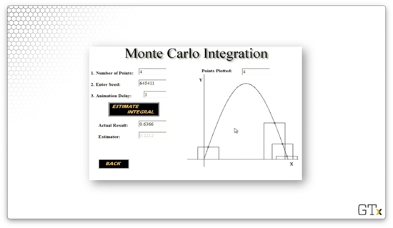 Let's look at a demo for estimating $I = \int_0^1\sin(\pi x)dx \approx 0.6366$. We've seen this application in a previous lesson. Basically, we are going to draw $n$ random rectangles, each with width $1/n$ and centered about a point, $x_i$, with height $f(x_i)$. We will add up the areas of the rectangles to approximate the integral.