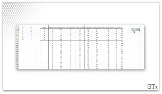 At the beginning of day three, we have three items in stock and we experience a demand for eight units. Therefore, our inventory at the end of the day, $I_3$, equals $0$. Because $I_3 < s = 3$, we place an order for $Z_i = S - I_3 = 10$ units, so $Z_3 = 10$. Our sales revenue is $3 * 10 = 30$, our order cost is $K + cZ_i = 2 + 4(10) = 42$. Our hold cost is $0$, because we have no items in stock, and our penalty cost is $5p = 5(2) = 10$ because we couldn't satisfy the demand for five units. Finally, our profit for the day is $30 - 42 - 10 = -22$.
