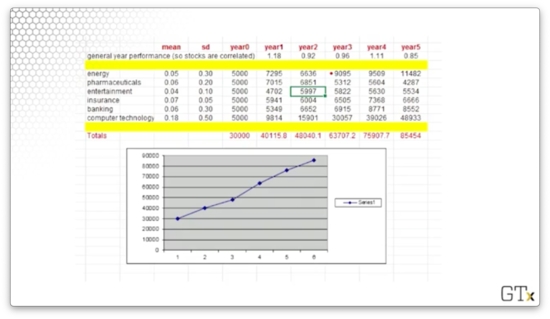 For each sector, we can see the mean and standard deviation for the expected returns in the first two columns. For example, energy has an expected return of $5\%$ but has a standard deviation of $30\%$.