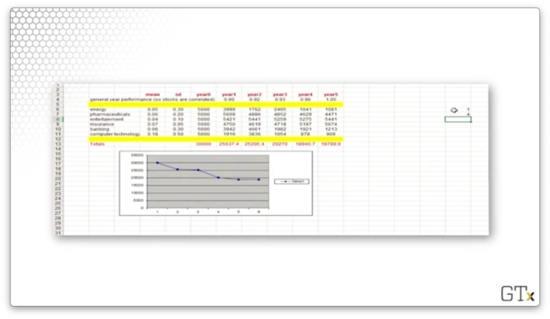 For each sector, we can see the year over year returns, and we can see the total portfolio returns at the bottom of each year column. Finally, we see the final portfolio value in the bottom-left cell, and we see a chart plotting the portfolio performance below.